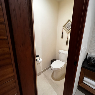 Opting for the Ocean Front King Suite in the Adults Only section, situated at the far end of the property, we found ourselves in a spacious haven. The room had ample closet and dresser space, not to mention the luxury of having not one, but two showers! The king-sized bed was very comfy, complemented by a very modern looking couch, a large desk, and even built-in surrounding Bluetooth speakers to enjoy our own music. To top it off, we were gifted reusable tumblers for convenient drink refills at the bar, part of Palmaïa’s waste reduction initiative. (Note: we did feel very awkward bringing these to the restaurant for dinner the first night - save these for the bars and casual dining, no need to bring them for dinner). In-room amenities included a coffee maker, microwave, and a mini-fridge stocked with refreshing water, juice, and kombucha (alcohol was not provided, but readily available at the various bars and restaurants). Additionally, complimentary bags of dried fruits and other snacks were refilled by housekeeping.